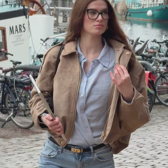 Het Maison Célora Elisé dames jacket in de kleur beige is een tijdloos en elegant item dat moeiteloos stijl en comfort combineert. Het jasje is vervaardigd uit een zachte suèdelook kwaliteit die zorgt voor een luxe uitstraling. Dankzij de oversized pasvorm valt het jack nonchalant en modern op het lichaam. De verborgen knoopsluiting aan de voorzijde geeft het ontwerp een minimalistisch en verfijnde touch. Dit bomberjack heeft geen zakken, waardoor de strakke belijning extra tot zijn recht komt. Perfect te combineren met zowel een casual jeans als een elegante pantalon voor een sophisticated everyday look.